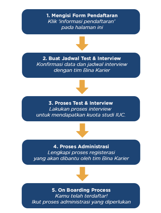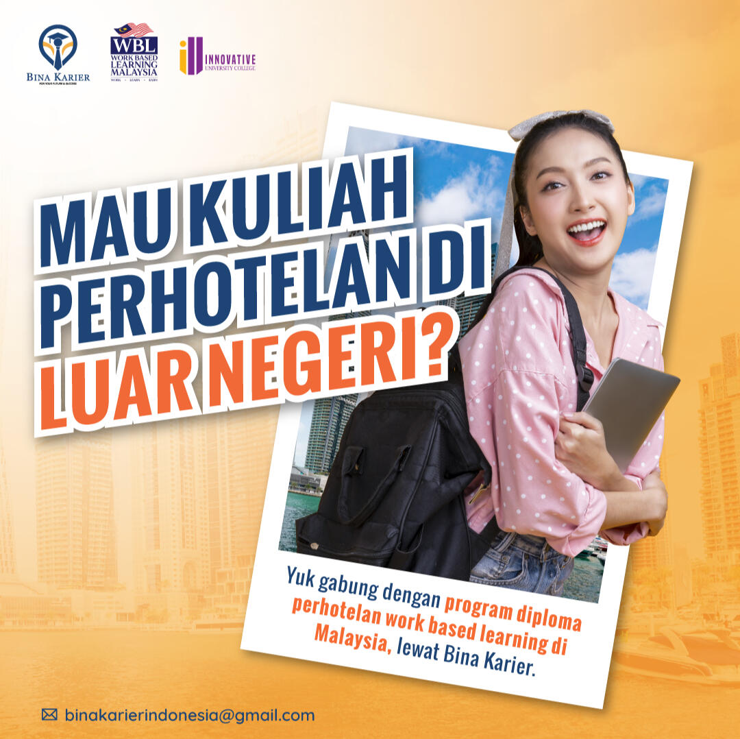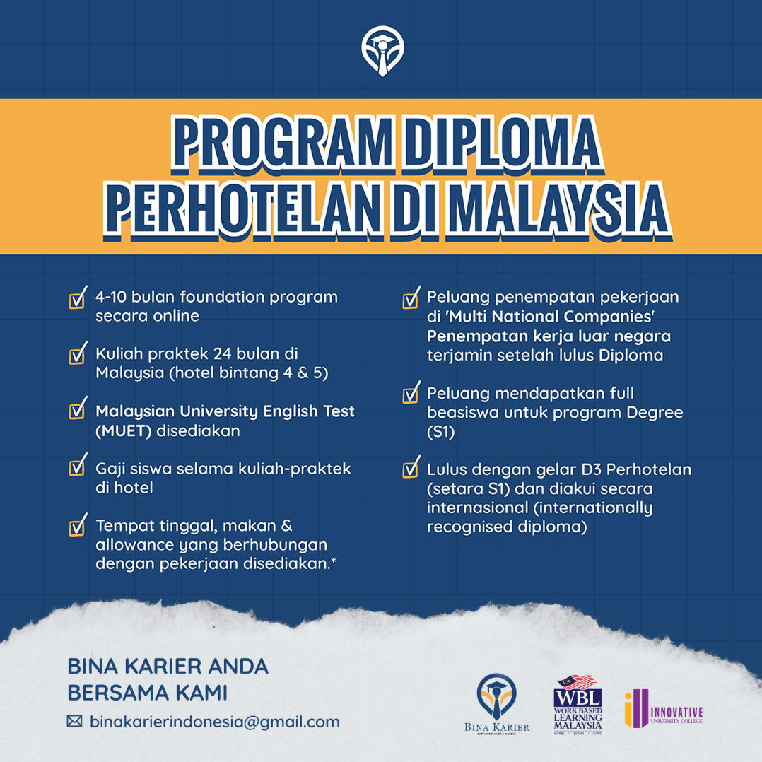 Kami, Bina Karier adalah sebuah platform yang menjembatani program kuliah Malaysia-Indonesia untuk anak-anak yang ingin kuliah di Malaysia. Saat ini, kami sedang membawa sebuah program perhotelan khusus dari hasil kerjasama antara Innovative University College (IUC, Malaysia) dengan KEMNAKER.