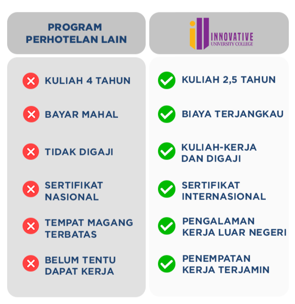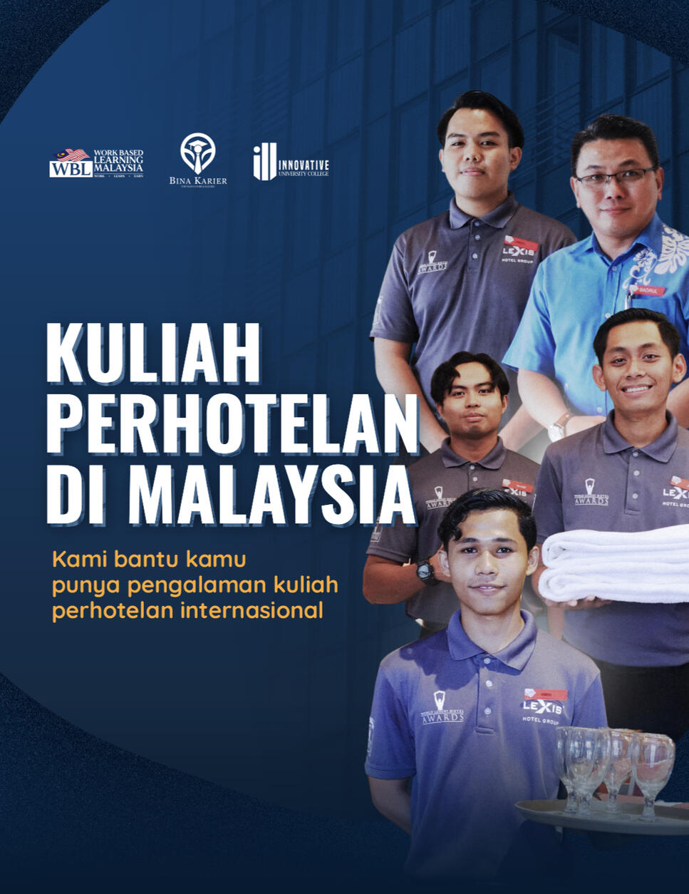 Kami menghadirkan program diploma perhotelan (D3) dengan total waktu 2,5 tahun. Murid akan kuliah sambil praktek langsung di Malaysia. Program ini merupakan program resmi yang memampukan mahasiwa Indonesia untuk kuliah di luar negeri dan mendapatkan pengalaman kerja Internasional.