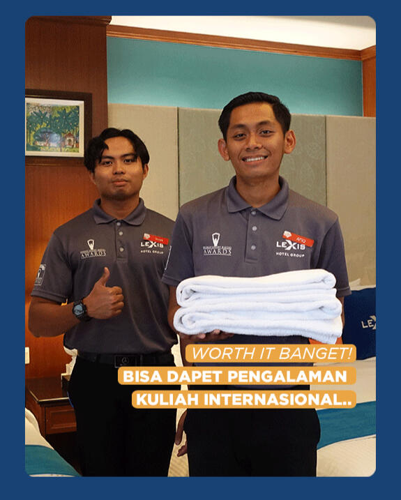 Menurut aku sih ini lebih worth it dibanding program perhotelan lain ya. Soalnya kita udah dapet pengalaman kerja di luar negeri, diajarin bahasa inggris juga, jadi kan nanti bisa kerja di hotel internasional juga ya…Untung aku sempet cobain kuliah perhotelan IUC. Nggak nyesel sama sekali sih. Worth it banget!